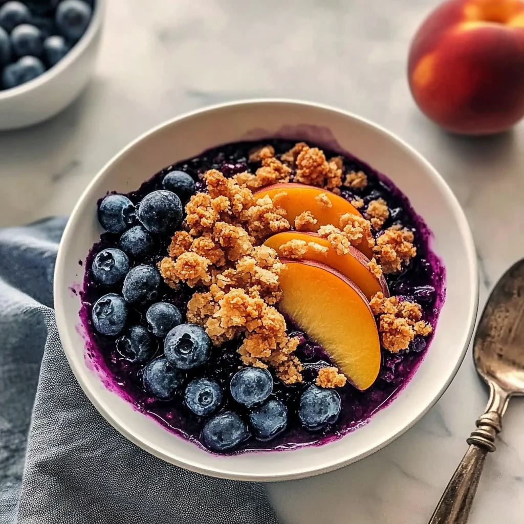A delicious and comforting dessert featuring a blend of sweet peaches and tart blueberries, topped with a crunchy oat and almond crumble.