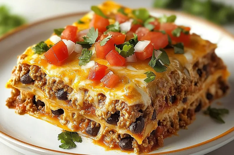 Imagine sinking your teeth into a warm, cheesy slice of Mexican lasagna with tortillas, where every layer bursts with the bold flavors of seasoned ground beef, zesty beans, and melting cheese. The aroma wafts through the kitchen like a warm embrace, making it nearly impossible to resist a second helping as the vibrant salsa and fresh cilantro dance atop each slice, inviting you to indulge in this hearty delight.